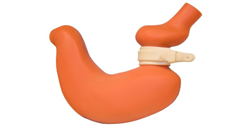 Bei einem Magenband wird ein elastisches Band aus Silikon fest um den oberen Teil des Magens geschnürt. Der Mageneingang ist dadurch verengt und er kann nur noch wenig Nahrung aufnehmen. Das Sättigungsgefühl tritt früher ein.