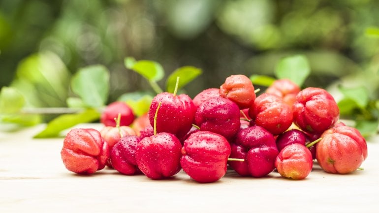 Ein weiteres Obst, das Antioxidantien in Form von Vitamin C enthält, ist die Acerolafrucht. Bei dem Obst handelt es sich um eine Kirsche, die auch verarbeitet in Pulverform erhältlich ist – allerdings ist das Nahrungsergänzungsmittel nicht gerade günstig, zudem fehlen aussagekräftige Studien.