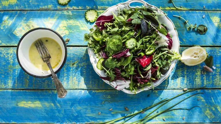 Salate sind eine gesunde und leichte Mahlzeit. Was häufig unterschätzt wird, ist das Dressing: Vor allem Fertigsalate kommen oft mit Saucen wie Ceasar-, Honig-Senf- oder French-Dressing daher, die auf gehaltvollen Zutaten wie Mayonnaise, Crème fraîche und minderwertigen Pflanzenfetten basieren. Wer seine Salatsauce selbst zubereitet, weiß, was drinsteckt und ist auf der sicheren Seite. Wie wäre es zum Beispiel mit einem Balsamico-Dressing mit frischen Kräutern und Zitrone?