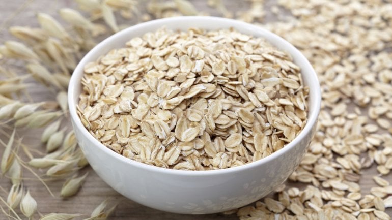 Auf einem Tisch steht eine Schale mit Haferflocken, daneben   liegen eine Haferähre und weitere Haferflocken.
