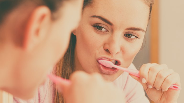 Eine Frau putzt sich vor einem Spiegel die Zähne.