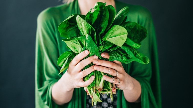 Eine Frau im grünen Gewand hält einen Strauß folsäurereichen Spinat vor sich