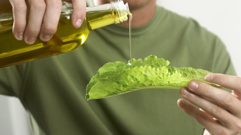 Das Bild zeigt einen Mann, der Öl auf ein Salatblatt gießt.