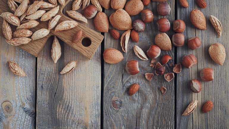 Eine Handvoll Nüsse am Tag bereichert den Speiseplan. Insbesondere Haselnüsse mit 27 mg pro 100 Gramm (g), aber auch Mandeln (25 mg) und Walnüsse (6 mg) sind gute Vitamin-E-Lieferanten. Nüsse enthalten außerdem wertvolle ungesättigte Fettsäuren, die sich günstig auf den Cholesterinspiegel auswirken, sowie hochwertiges Eiweiß und Ballaststoffe.