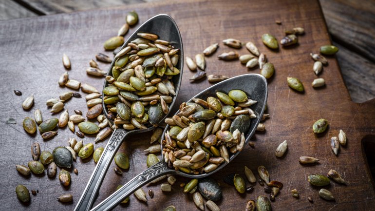 Auch Sonnenblumenkerne, Kürbiskerne und Pinienkerne sind wertvolle Vitamin-E-Quellen. Sie passen etwa zu Salaten, Suppen oder Nudelgerichten. Besonders gut schmecken sie leicht angeröstet.