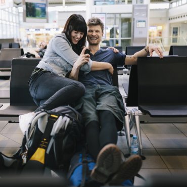 Mann und Frau sitzen sich gegenüber und verschlingen Ihre Beine hinter dem anderen