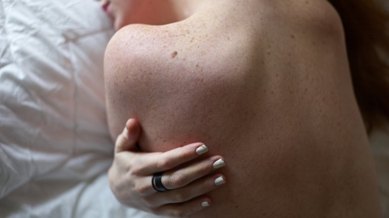 Eine Frau liegt mit nacktem Oberkörper im Bett, man sieht ihren nackten Rücken.