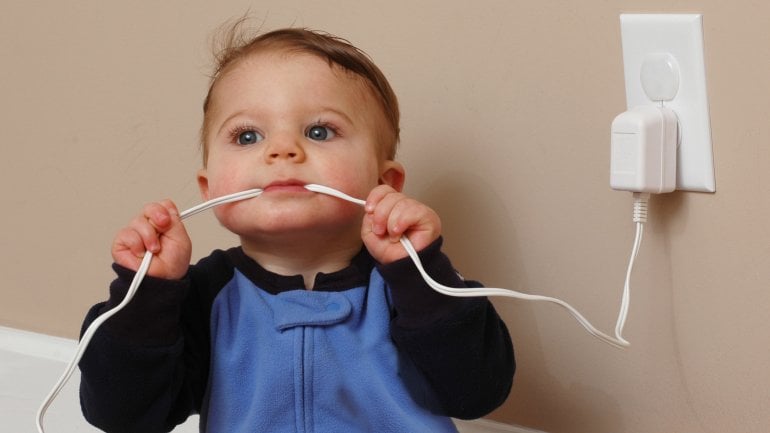 Gibt es Elektrogeräte im Kinderzimmer, ist es ratsam, ihre Sicherheit regelmäßig zu überprüfen. Defekte Geräte können Stromschläge verursachen. Steckdosen sollten mit Kindersicherungen versperrt, Kabel immer unter Putz verlegt werden.