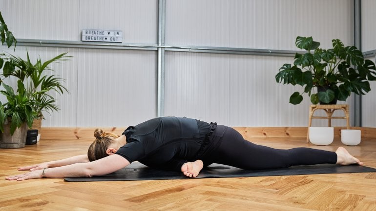 - Sie sollten jetzt eine Dehnung in den Oberschenkeln spüren. Ist die Dehnung zu intensiv, können Sie die Knie ein wenig beugen.