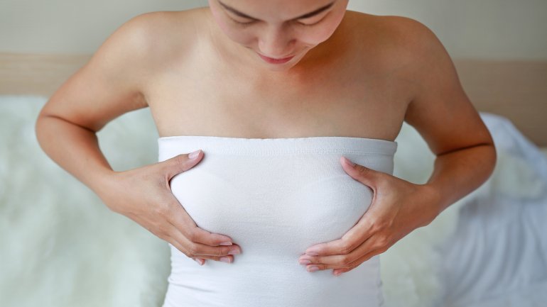 Aus den Brüsten kann schon früh die sogenannte Vormilch austreten. Die medizinische Bezeichnung für Vormilch ist Kolostrum. Sie ist das Vorstadium der reifen Muttermilch und meist dickflüssig und geblich.