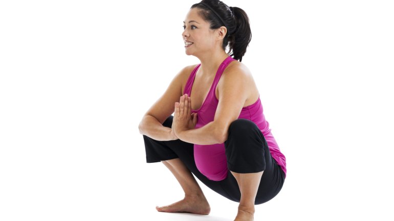 Gehen Sie in die Hocke, Füße flach am Boden, Rücken gerade. Drücken Sie mit den Ellbogen von innen gegen die Knie. Diese Übung kann das Risiko auf einen Dammriss mindern und dem Baby helfen, mit dem Kopf ins Becken zu rutschen.