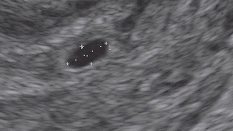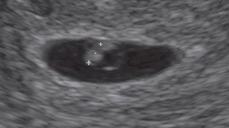 Rechts im Bild ist die Fruchthöhle (schwarz) zu sehen. Der Embryo ist jetzt etwa zwei Millimeter lang und auf dem Ultraschall zu dieser Zeit oft noch nicht zu erkennen. Trotzdem beginnt in dieser Woche das Herz des Embryos zu schlagen.