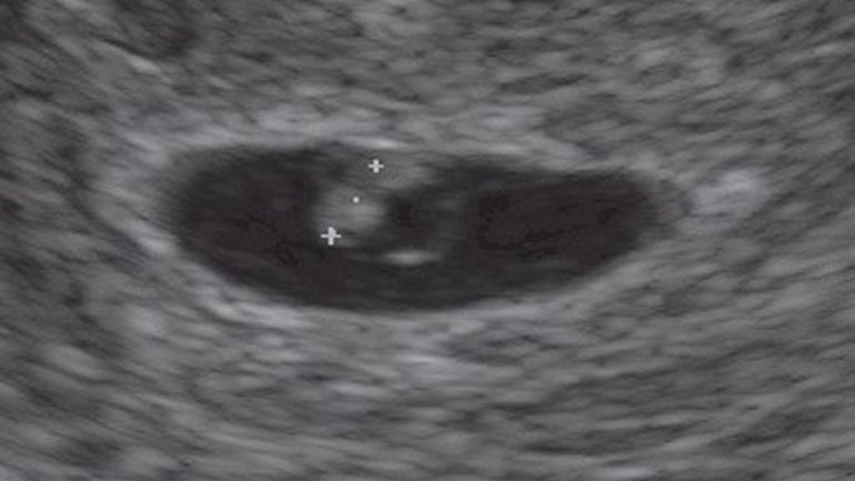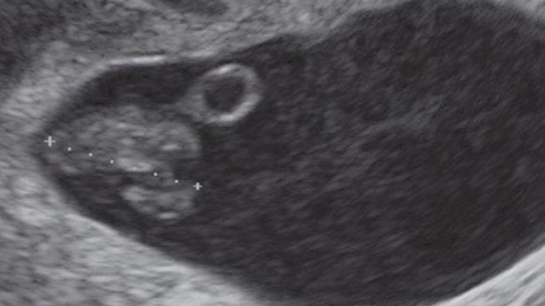 Links in der Fruchtblase ist der etwa fünf Millimeter lange, wie eine Bohne gekrümmte Embryo sichtbar. Der helle Kreis mit dunklem Fleck über dem Embryo ist der Dottersack, der den Embryo momentan noch mit Nährstoffen versorgt, bis die Plazenta diese Aufgabe voll übernehmen kann.