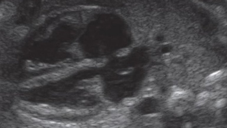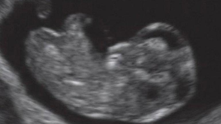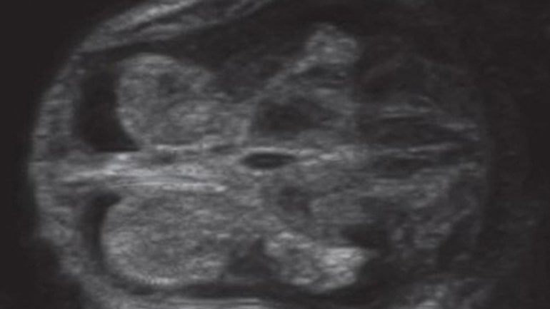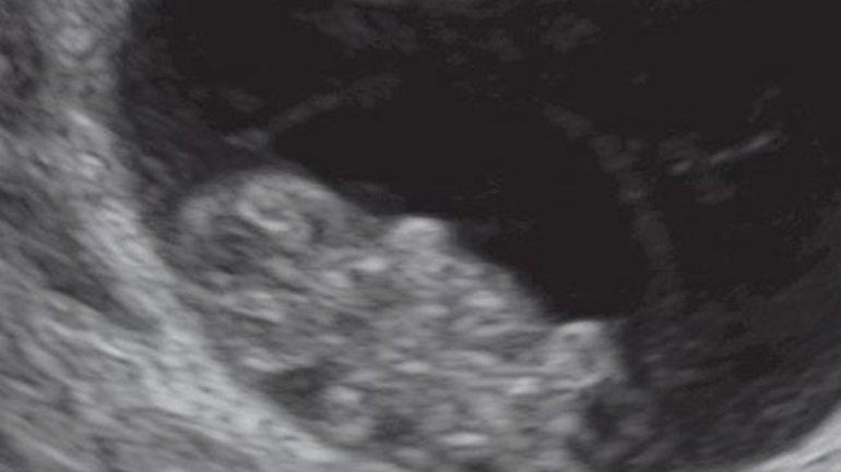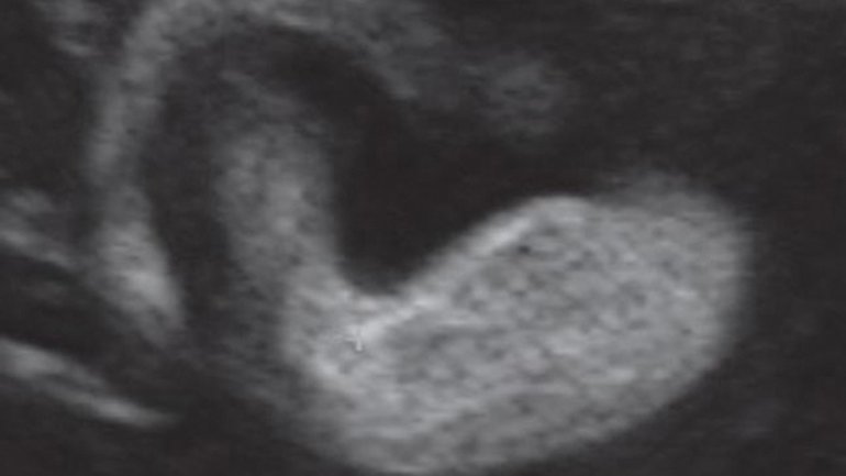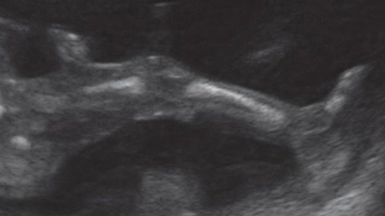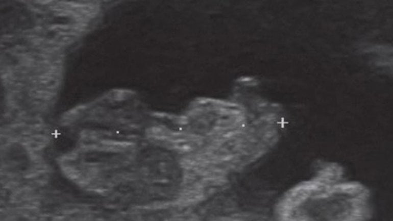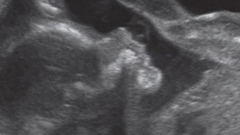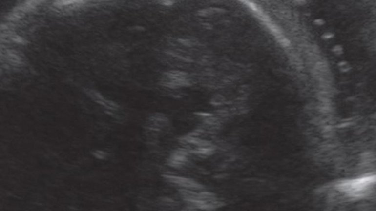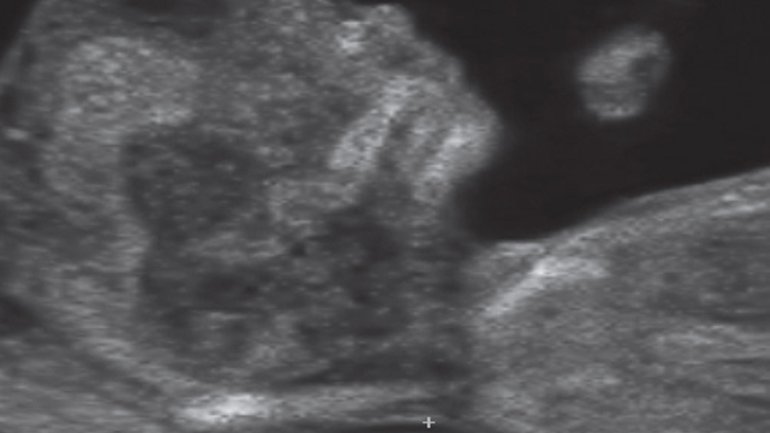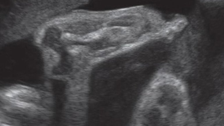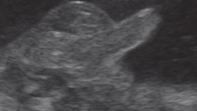 Auf dem Ultraschallbild sieht man den Kopf und einen Teil des Oberkörpers. Im Kopf sieht man die Schädelknochen und die Anlagen von Kiefer und Zähnen, im Oberkörper den Knochen des Schlüsselbeins. Auch die kleine Nase und der Mund sind gut zu erkennen – und das, obwohl der Fötus nur fünf Zentimeter misst.