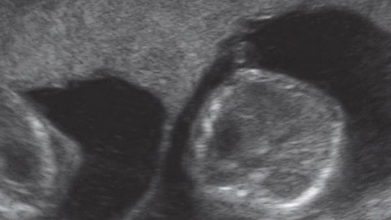 Auf diesem Bild sieht man eine Zwillingsschwangerschaft mit zwei Fruchtblasen. Die meisten Zwillinge, ob eineiig oder zweieiig, haben eine eigene Fruchtblase und eine eigene Plazenta. Selten teilt sich die befruchtete Eizelle bei eineiigen Zwillingen erst spät in der Entwicklung in zwei Embryos auf, was zu einer gemeinsamen Fruchtblase und Plazenta führt. Ab dieser Woche kann man mit etwas Glück das Geschlecht des Babys erkennen.