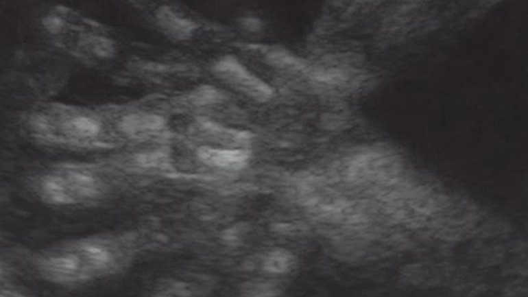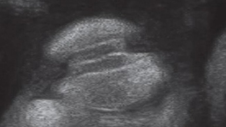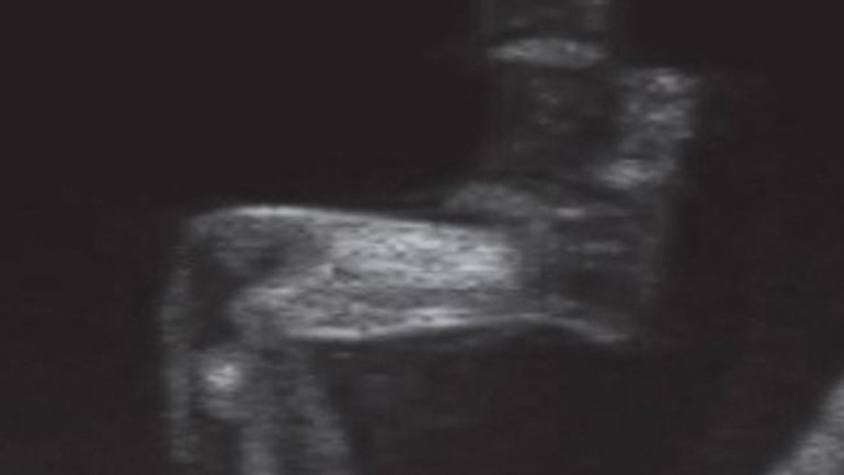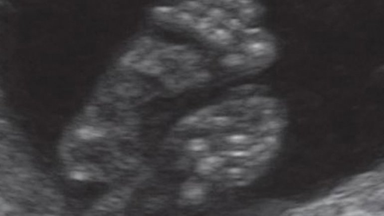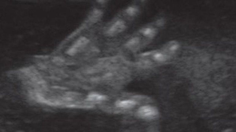 Auf dem Ultraschallbild erkennt man mit etwas Übung beide Hände und einen Fuß: Von rechts unten kommt der Fuß ins Bild, die Zehen zeigen nach links oben. Der Fuß liegt über den beiden Händen, die überkreuzt sind. Eine Hand kommt dabei von oben rechts ins Bild, die Finger beider Hände fächern sich nach links auf.