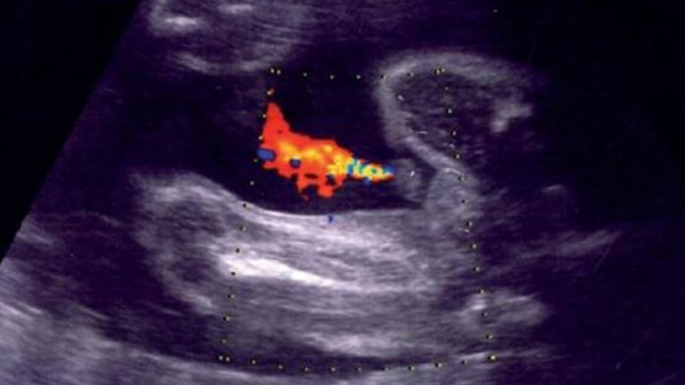 Auf diesem Bild sind deutlich die vier Herzkammern und die Herzklappen zu erkennen. Das Herz schlägt jetzt schon seit 33 Wochen unablässig, was auf dem CTG gut zu hören ist.