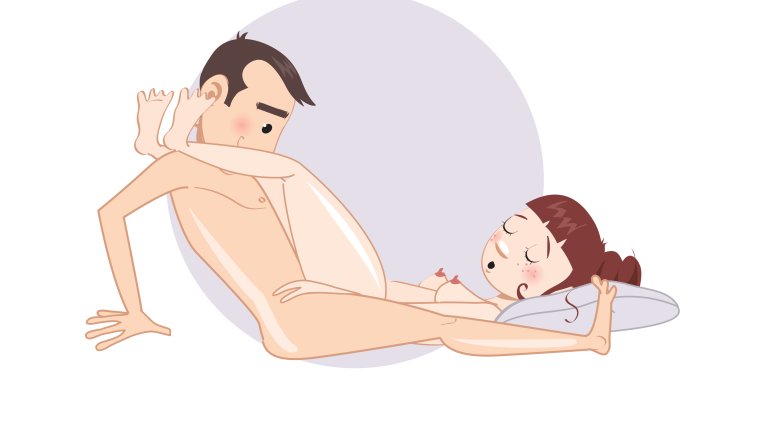Die Frau liegt auf dem Rücken, wobei sie ihren Kopf mit einem Kissen stützt. Sie streckt beide Beine gerade in die Luft. Der Mann kniet vor ihr (seine Brust berührt ihre hinteren Oberschenkel) und drückt ihre Beine mit leichtem Druck auf eine Seite. Dann dringt der Mann in sie ein. Er kann dabei seine Hände auf dem Bett, dem Boden oder auf einer der Seiten des Oberkörpers der Frau platzieren, um die Bewegung zu unterstützen.