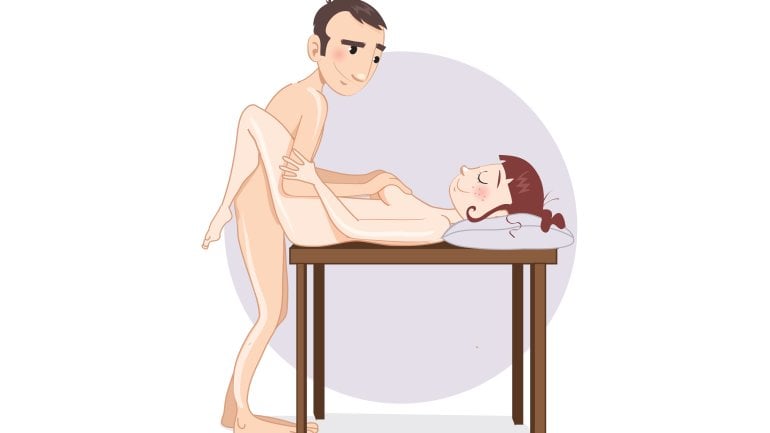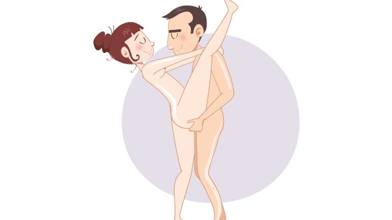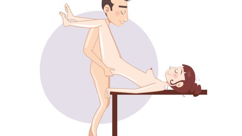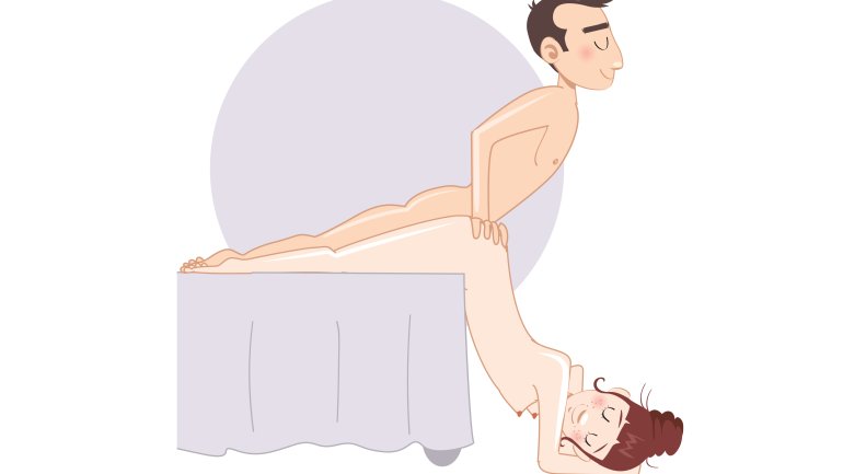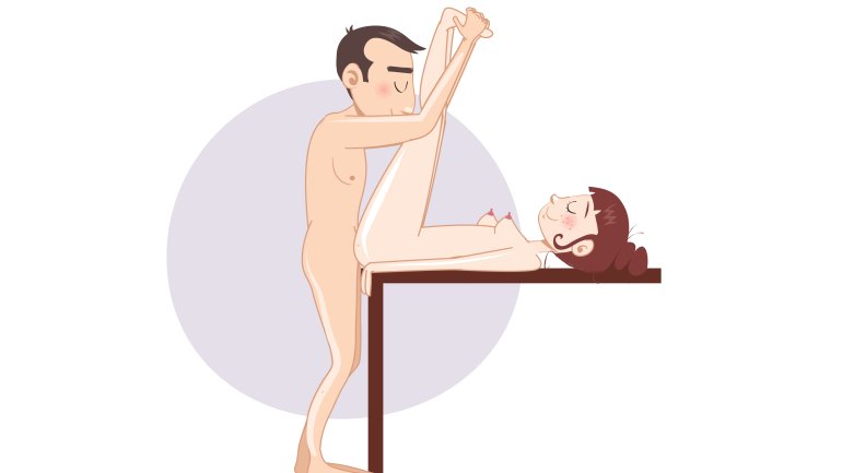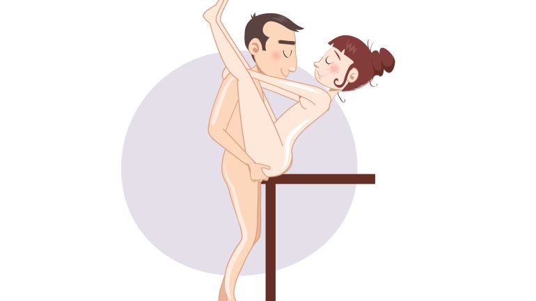 Diese Stellung verlangt akrobatische Fähigkeiten! Aufgepasst: Die Frau setzt sich als erstes auf eine Tischkante. Er stellt sich vor sie, die Beine leicht gebeugt. Nun stützt sie sich auf seinen Schultern ab, zieht erst das rechte, dann das linke Bein nach oben und drückt sie sanft gegen seine Schultern. Er gibt ihr Halt, indem er ihren Po festhält. Nun kann das Liebesspiel beginnen ...
