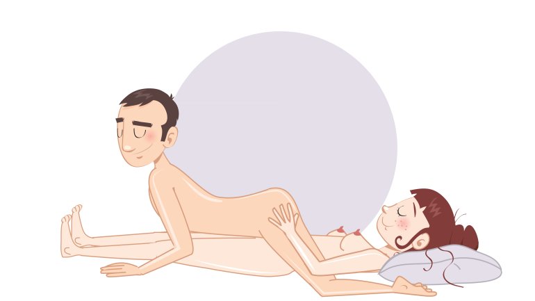Sie liegt bäuchlings mit dem Rücken zu ihm. Er kniet neben ihr und schaut auf ihren Hinterkopf, sodass beide senkrecht zueinander positioniert sind. Er schiebt sein Knie, welches näher an ihr ist, zwischen ihre Beine und dringt in sie ein. Sie schiebt ihr "freies" Bein weiter nach außen, sodass er einen besseren Blick auf ihren Po hat und sich besser an ihren Hüften festhalten kann, während er sie mit seinen Schüben befriedigt.