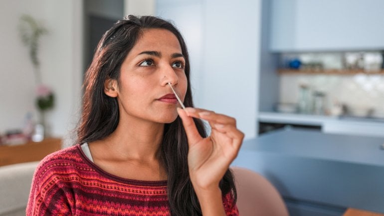 Viele Menschen führen den Corona-Selbsttest nur zaghaft durch und führen das Stäbchen nicht tief genug in die Nase ein. Wer beim Testvorgang Probleme hat, sollte eine andere Person bitten, den Test vorzunehmen.