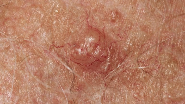 Ein Basaliom, auch Basalzellkarzinom genannt, hat im Gegensatz zum schwarzen Hautkrebs häufig die Farbe der normalen Haut. Zu Beginn erscheint es häufig als durchscheinendes, wachsartiges Knötchen. Mitunter ist es von feinen Äderchen durchzogen.