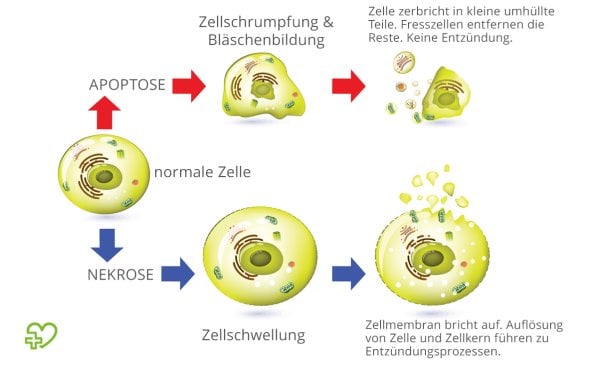 Eine Apoptose kann Folge äußerer Einwirkung sein, aber auch durch körpereigene Signale entstehen. Anders als bei der Nekrose, bei der ein Zellverband beziehungsweise Gewebe zugrunde geht, vollzieht sich die Apoptose nur an einzelnen Zellen und entsteht durch das genetische Programm der Zelle. In vielen Fällen treten Nekrose und Apoptose gleichzeitig auf, zum Beispiel bei Organschäden.