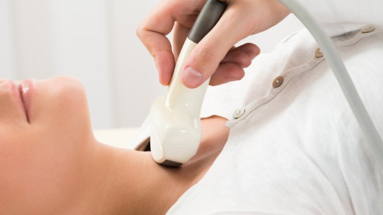 Um eine chronische Schilddrüsenentzündung festzustellen, ist neben den Blutwerten auch eine Ultraschalluntersuchung (Sonographie) unverzichtbar. Mit dem Schallgerät kann der Arzt beispielsweise knotige Veränderungen der Schilddrüse erkennen.