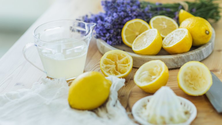 Zitronensaft kann gegen fettige Haut helfen, da er den pH-Wert der Haut regelt und antibakteriell wirkt. Zudem kann er dazu beitragen, große Poren zu verkleinern. Vermengen Sie einfach zwei Teelöffel Zitronensaft mit einem Teelöffel destilliertem Wasser. Saugen Sie die Mischung mit einem Watte- oder Stoffpad auf und tragen sie im Gesicht auf. Nach zehn Minuten waschen Sie Ihr Gesicht mit lauwarmem Wasser ab.