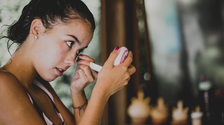 Das Bild zeigt eine Frau, die sich eine Kontaktlinse einsetzt.