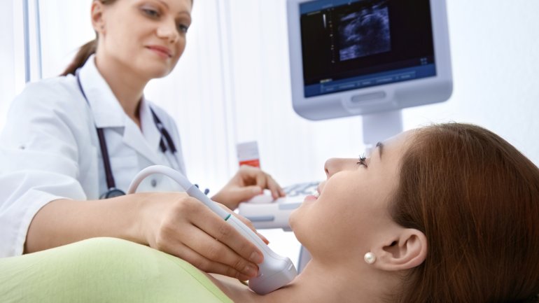 Man sieht eine Ärztin, die bei einer Patientin eine Schilddrüsensonographie durchführt.